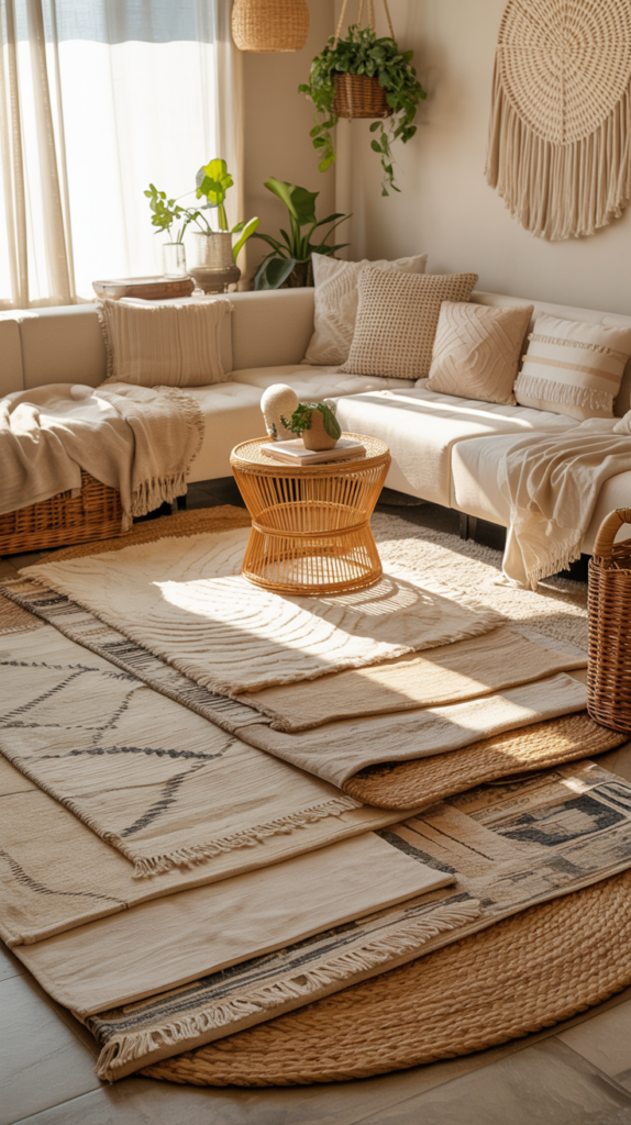 Layering rugs instantly adds depth and coziness. Start with a large jute rug, then layer a patterned rug on top.