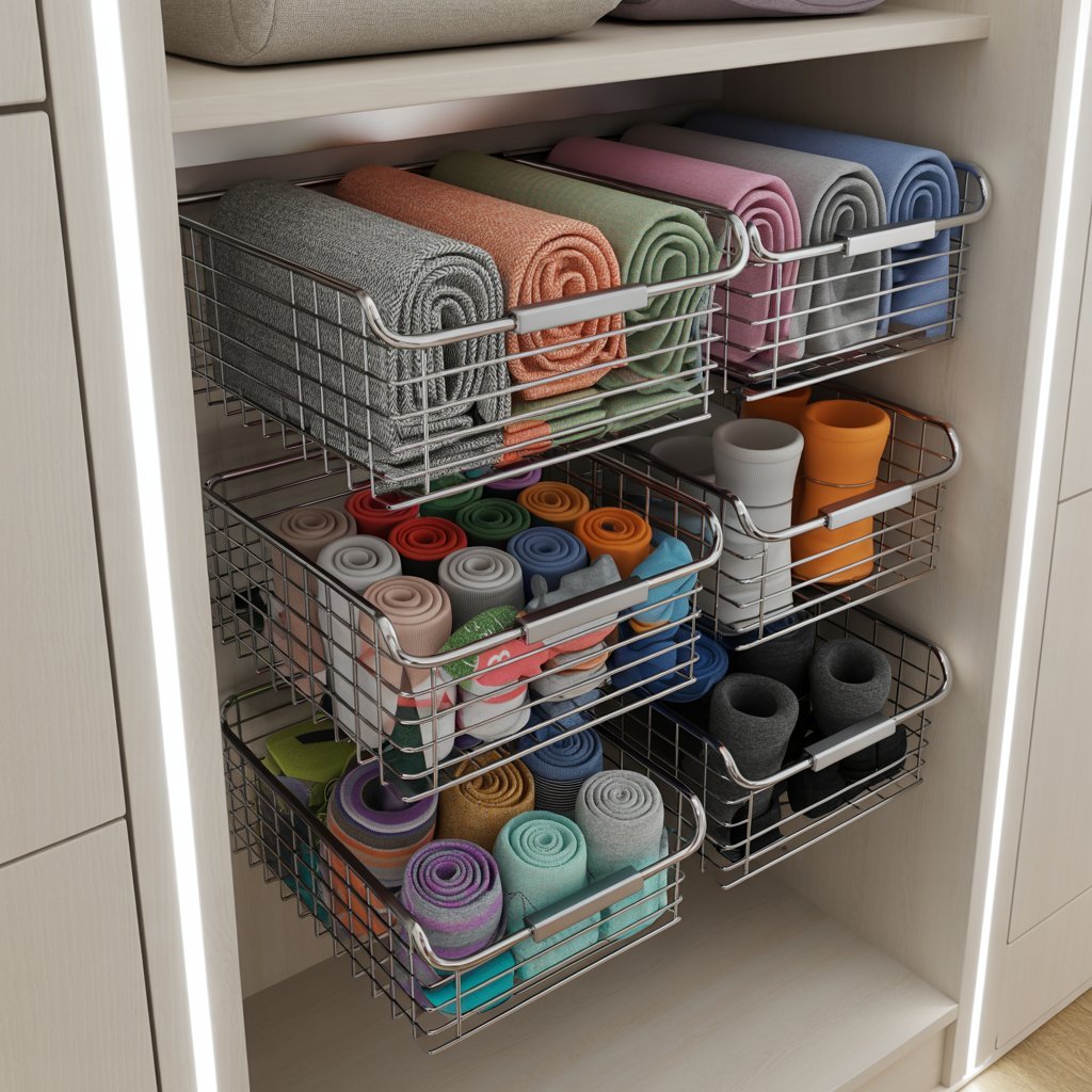 Pull-out bins or baskets are perfect for smaller items like scarves, socks, or workout clothes. Easy to grab, easy to store.