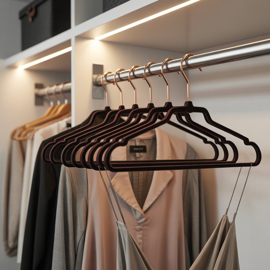 Slim velvet hangers save space, prevent clothes from slipping, and instantly make your closet look more uniform and luxurious.