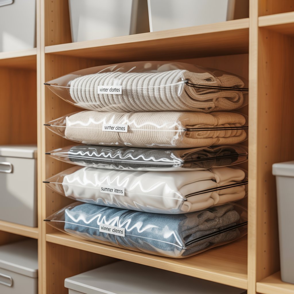 Store off-season clothes in vacuum-sealed bags or bins to free up valuable space for current items.